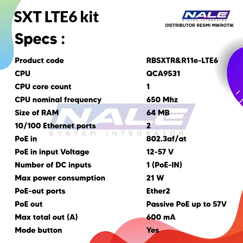 Kit SXT LTE6 adalah perangkat untuk lokasi terpencil yang berada dalam jangkauan jaringan seluler. Karena desain chip LTE yang canggih dan antena gain tinggi, ia dapat menyediakan konektivitas untuk gedung Anda bahkan saat ponsel rusak.